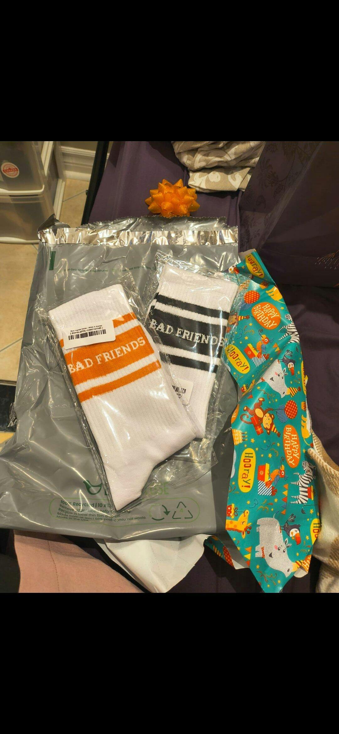 Double the socks, double the bad decisions. You’ll get two pairs - one orange, one black - because just like Bobby & Andrew, Bad Friends come in twos. Cozy, comfy, and perfect for putting your best bad foot forward.