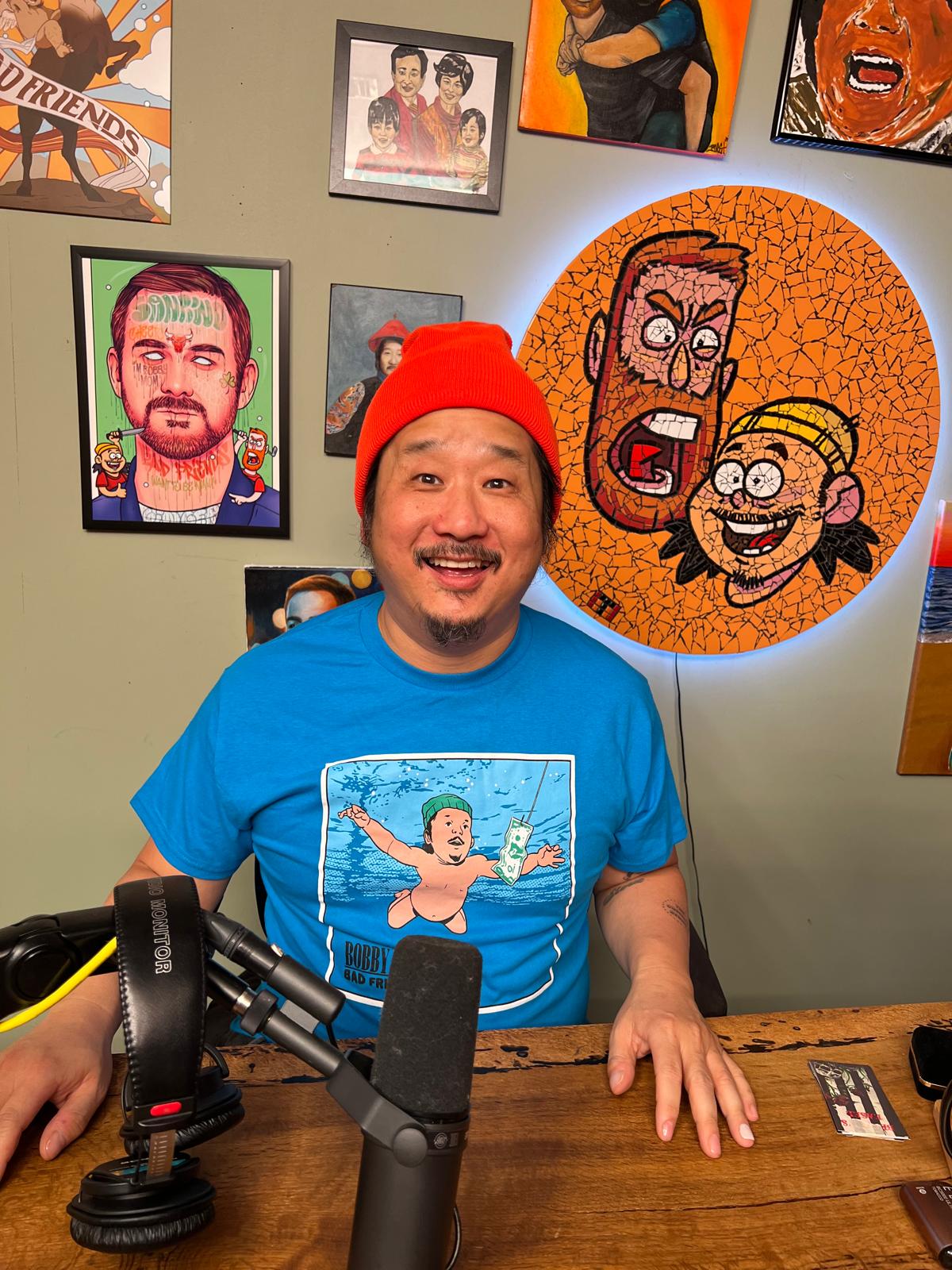 Bobby is wearing a size Medium and Andrew is wearing a size Large.